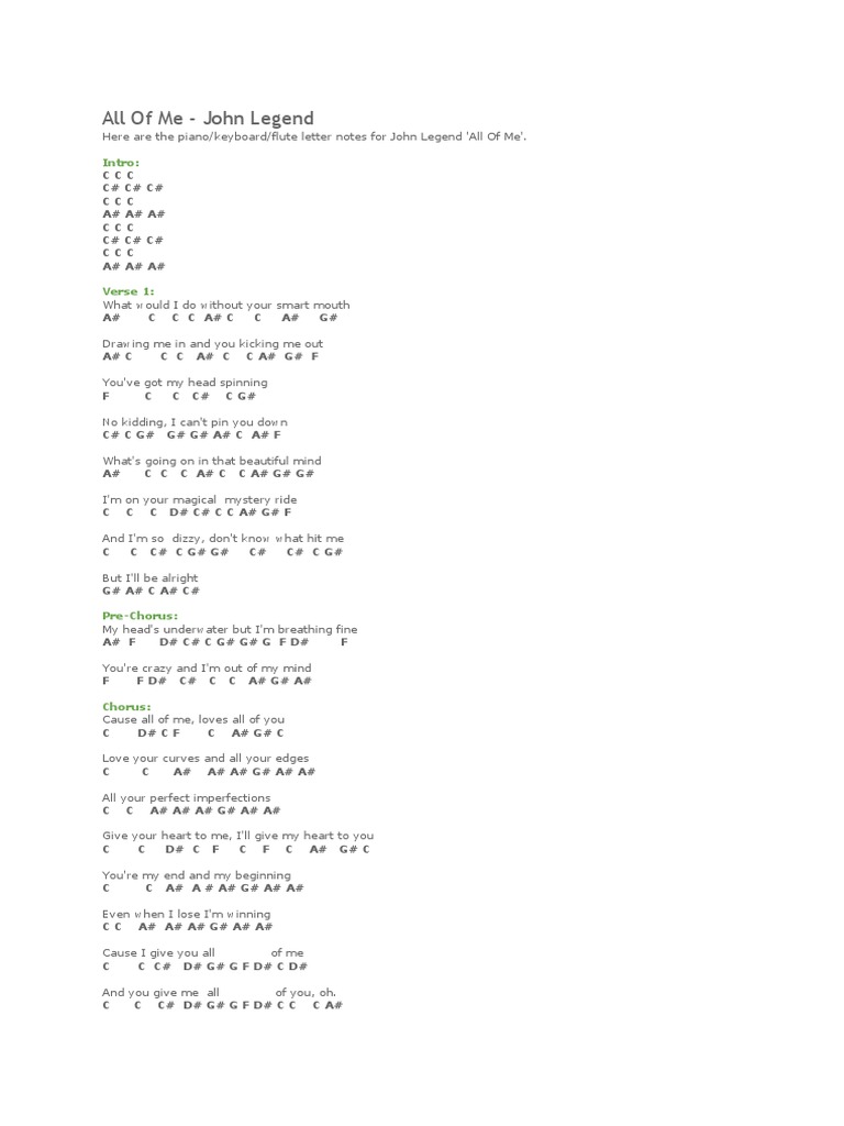 All Of Me Voice Piano John Legend Free Piano Sheet Music Piano Chords from www.everyonepiano.com Here are the piano/keyboard/flute letter notes for john legend 'all of me'. Hi, i´m going to play all of me with a band but can´t find the correct notes anywhere. In this article, we will not only show you the notes with letters but also a free and easy video tutorial.